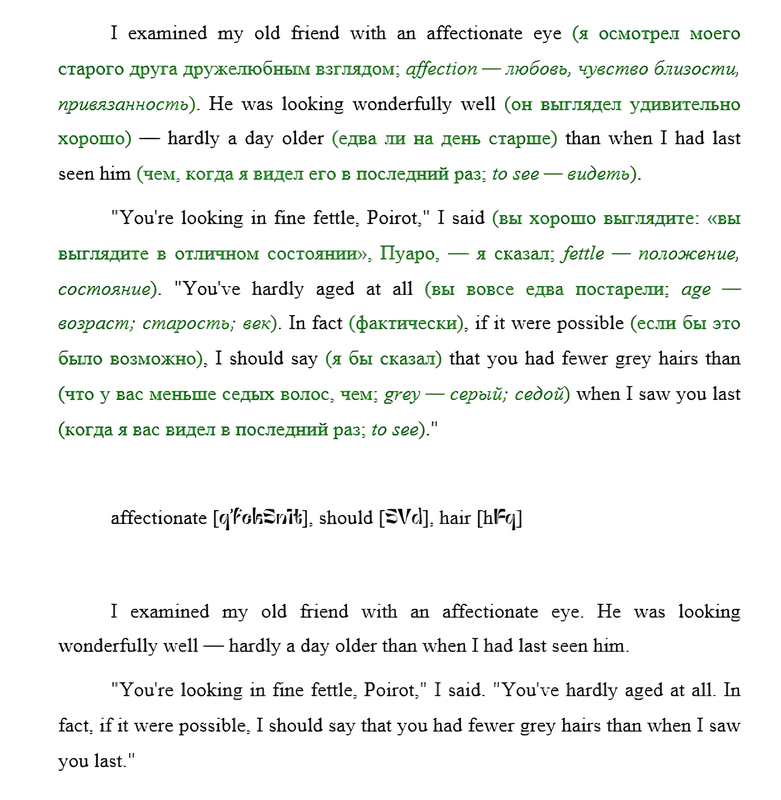 Для наглядности прикладываем пример отрывка из детектива Агаты Кристи «Убийства по алфавиту», переработанный по методу Ильи Франка.